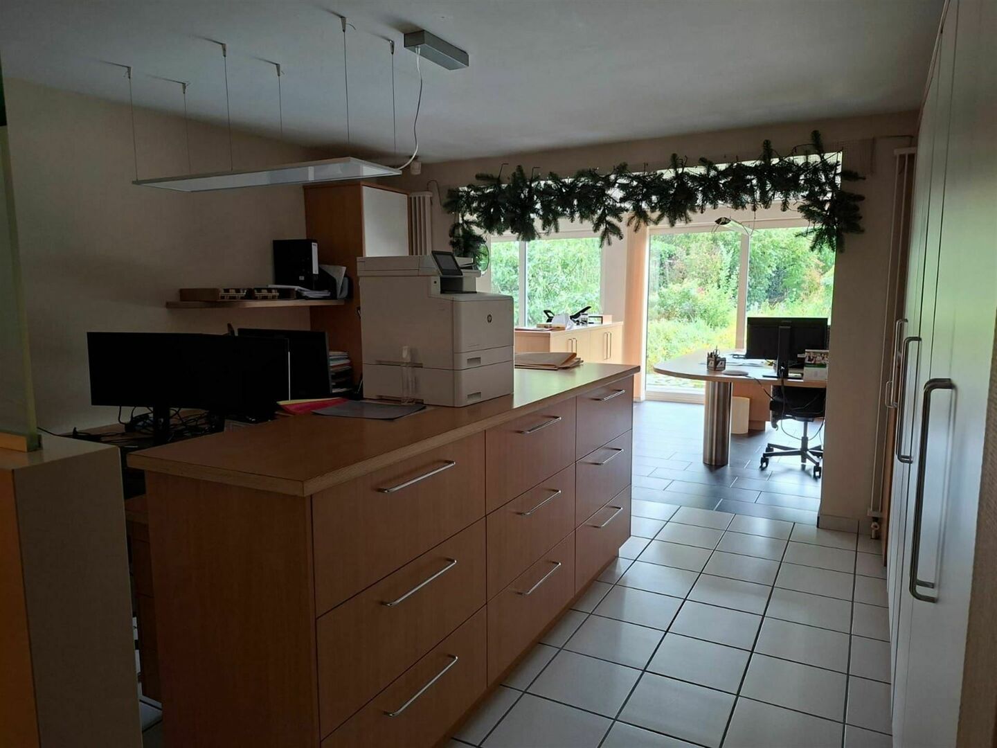 Ontvangstloket met wachtruimte, open landschapskantoor met 3 werkplekken, aparte bureau- of consultatieruimte, zithoek, volledig uitgeruste keuken, toiletruimte en extra opberg- of vergaderruimte.