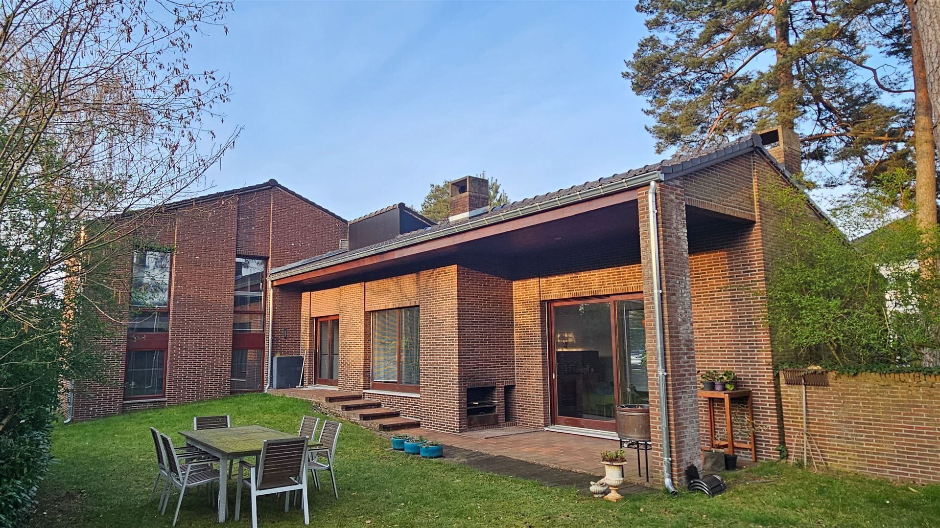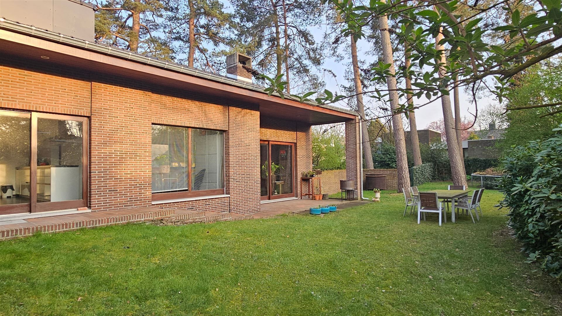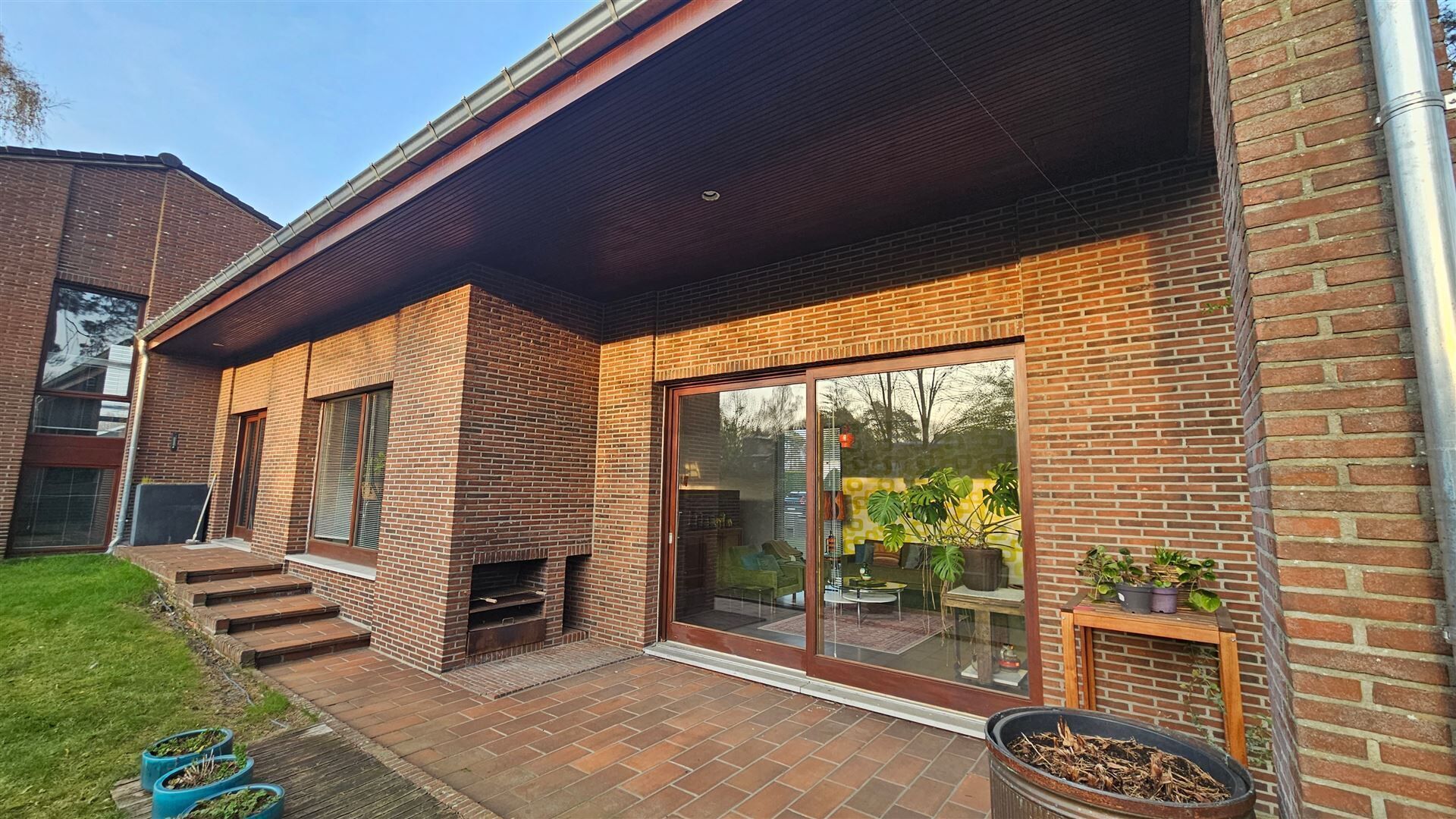 Parkeren kan in de dubbele inpandige garage. Achteraan geniet je van een zonnige tuin met overdekt terras en buitenhaard — ideaal om in alle rust te ontspannen.