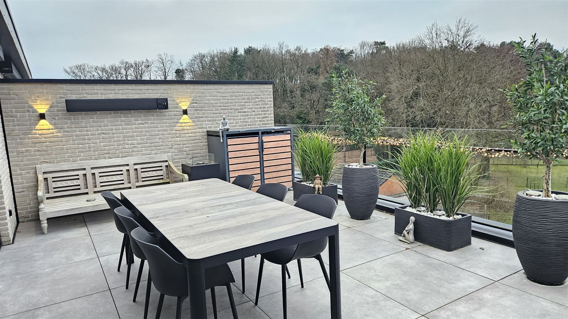 Het ruime, fraai aangelegde terras biedt een aangenaam uitzicht op het groen en vormt de perfecte plek om in alle rust van de zon te genieten.