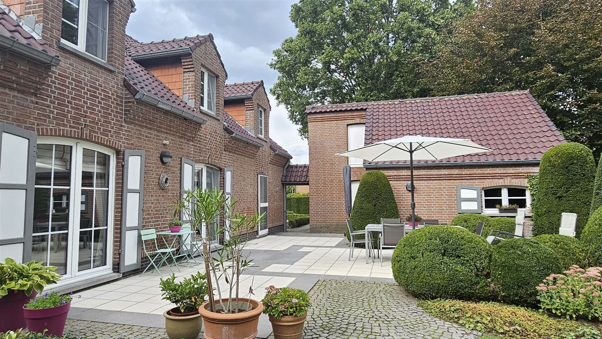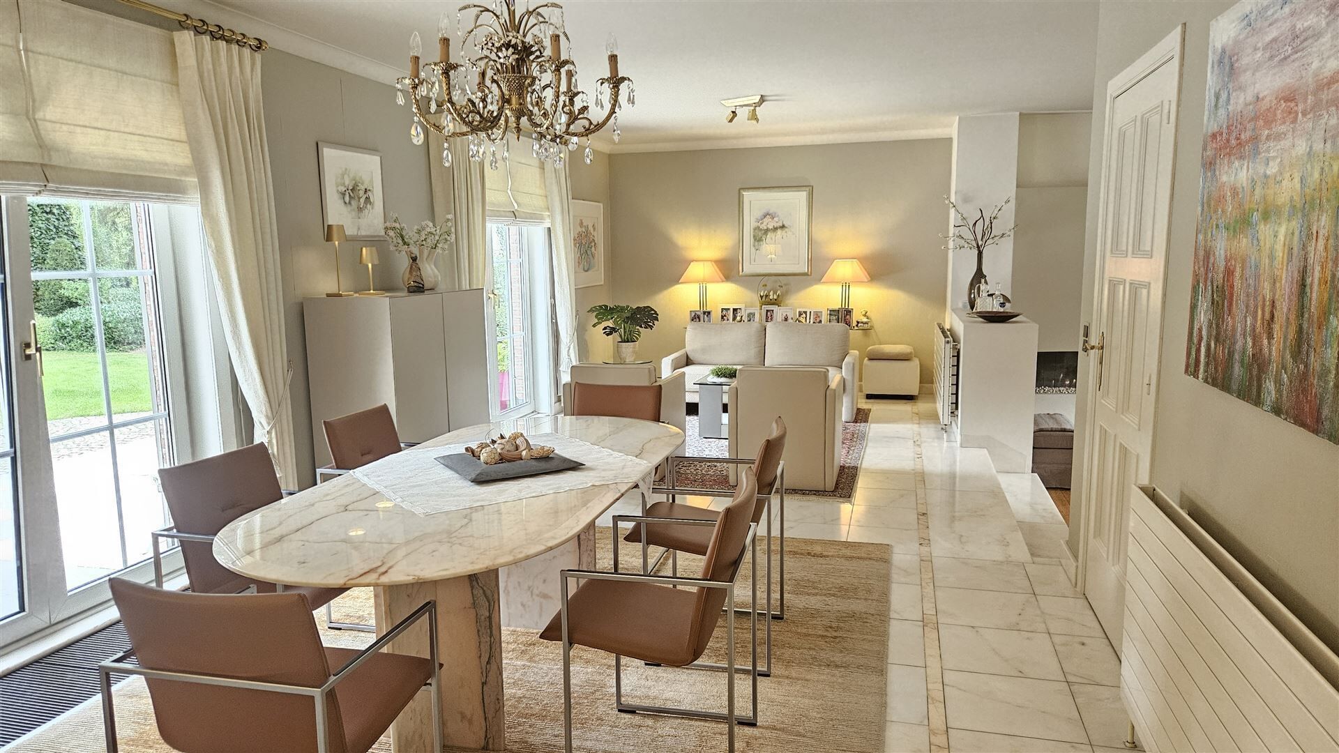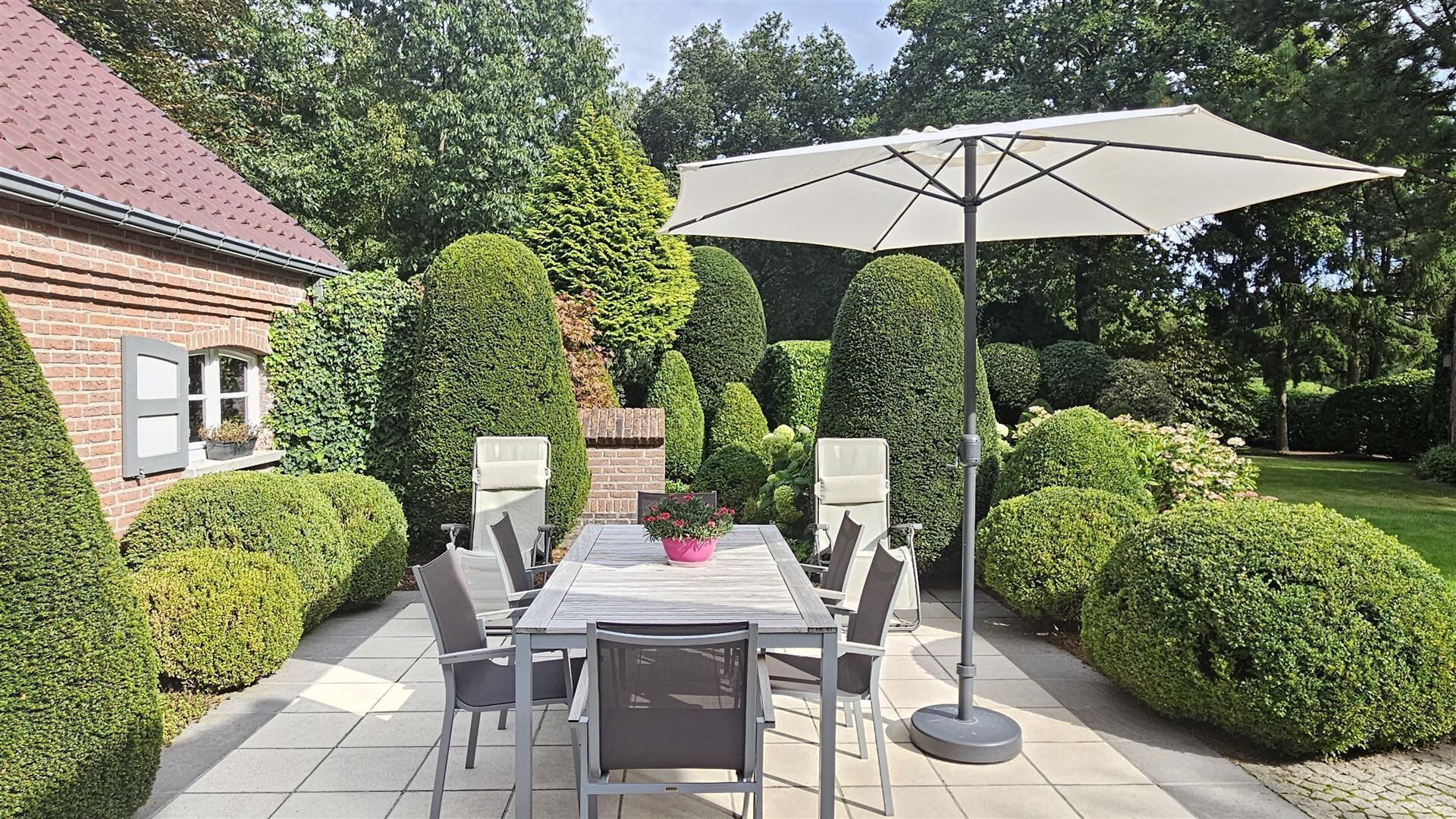 Vanuit de eetkamer heeft u directe toegang tot het zonnige terras en de prachtig onderhouden tuin, ideaal voor gezellige momenten in alle rust en privacy.