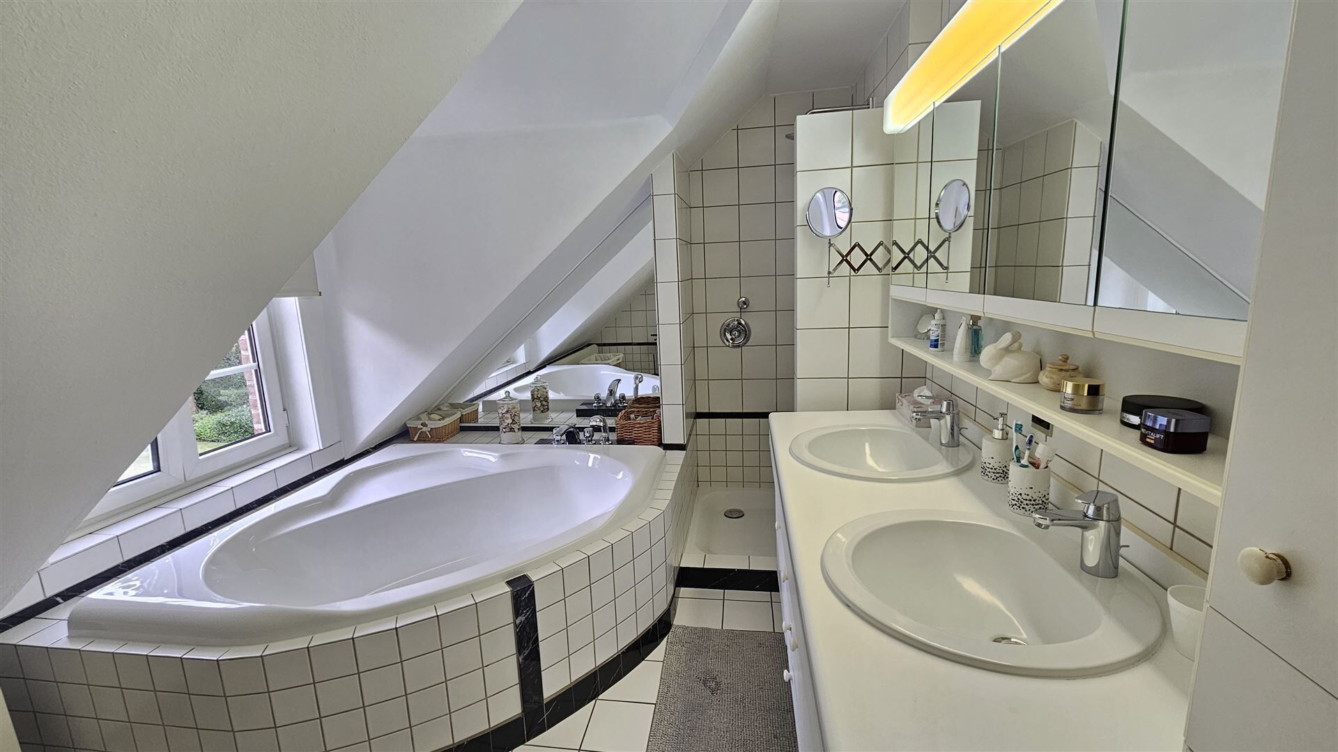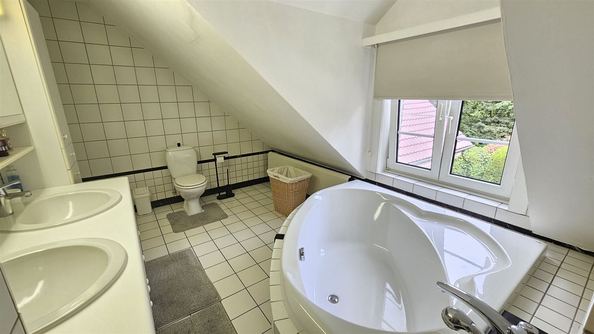 4 slaapkamers en badkamer met een bad, douche, toilet en dubbele lavabo.